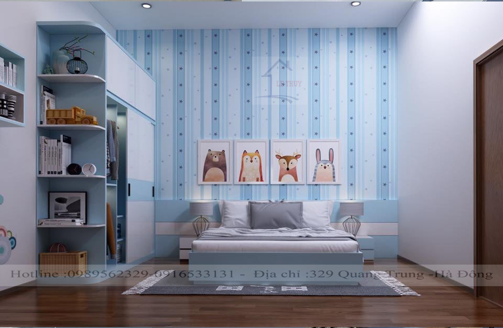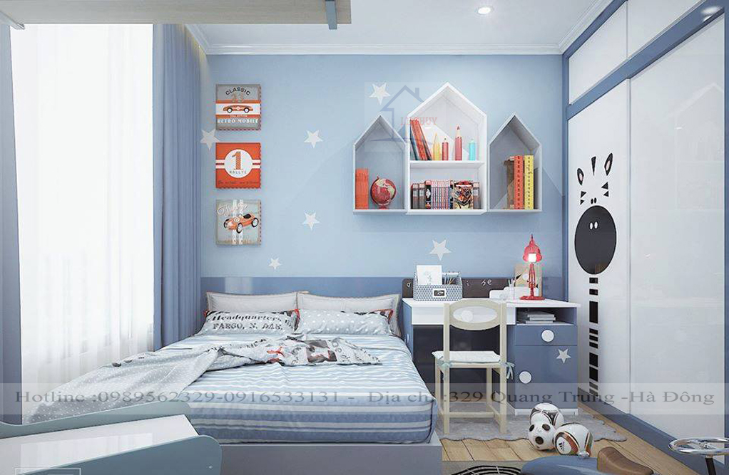 Màu xanh da trời, xanh biển hay xanh lá, xám phối với màu trắng luôn là sự lựa chọn phổ biến cho phòng ngủ bé trai. Có thể kết hợp các họa tiết hay các vật dụng trang trí như ô tô, bóng, động vật biển, …để tăng thêm phần sinh động, thú vị cho căn phòng.