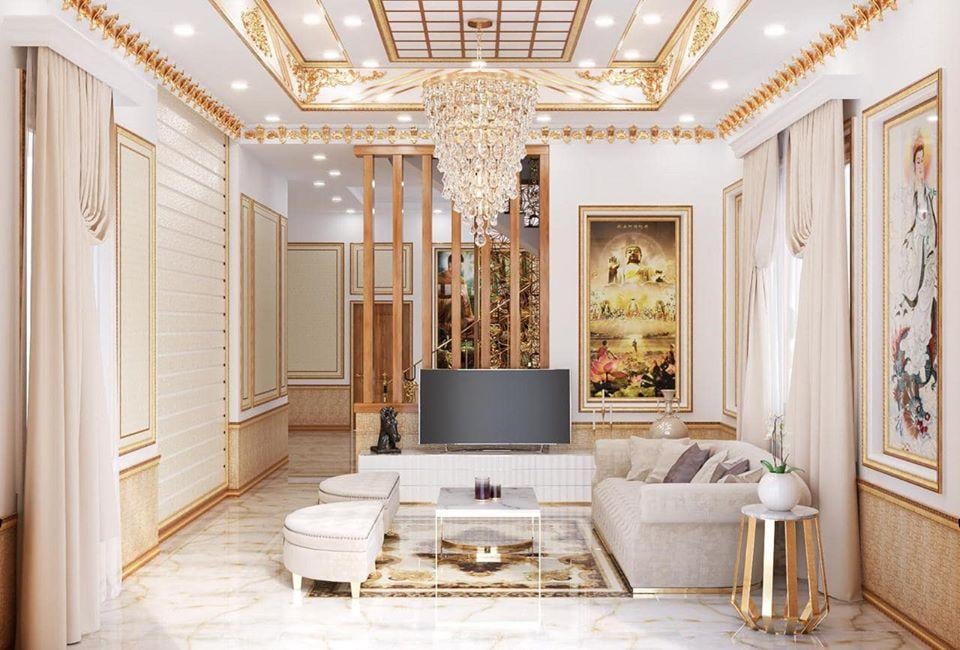 Mẫu thiết kế nội thất phòng khách trên đây vừa mang phong cách, cổ điển kết hợp với tân cổ điển và nội thất ở đây mang đậm phong cách châu âu. Nó đưa bạn lạc vào thế giới của giới hoàng gia. Điểm nhấn ở mẫu thiết kế này là bộ sofa mang đậm bản chất sự giàu có của gia chủ, màu sắc ở đây màu chủ đạo là màu nâu xám, tím hào với một màu trắng của kệ ti mang lại một căn phòng, có thiết kế đa phong cách