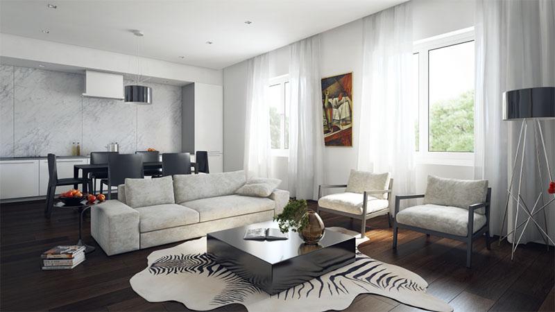 Ngược lại với kiểu thiết kế nội thất cổ điển ở trên, thì thiết kế nội thất phòng khách hiện đại chú trọng sử dụng những vật dụng trang trí có phần đơn giản và bớt rườm rà hơn nhưng vẫn thể hiện được sự, độc đáo, tinh tế cũng như sự đẳng cấp của căn phòng. Đặc điểm chung của nội thất theo kiểu hiện đại ở mẫu này, thường sử dụng những mẫu ghế sofa độc đáo kết hợp cùng tấm thảm lót phía dưới tạo nét tinh tế cho căn phòng.