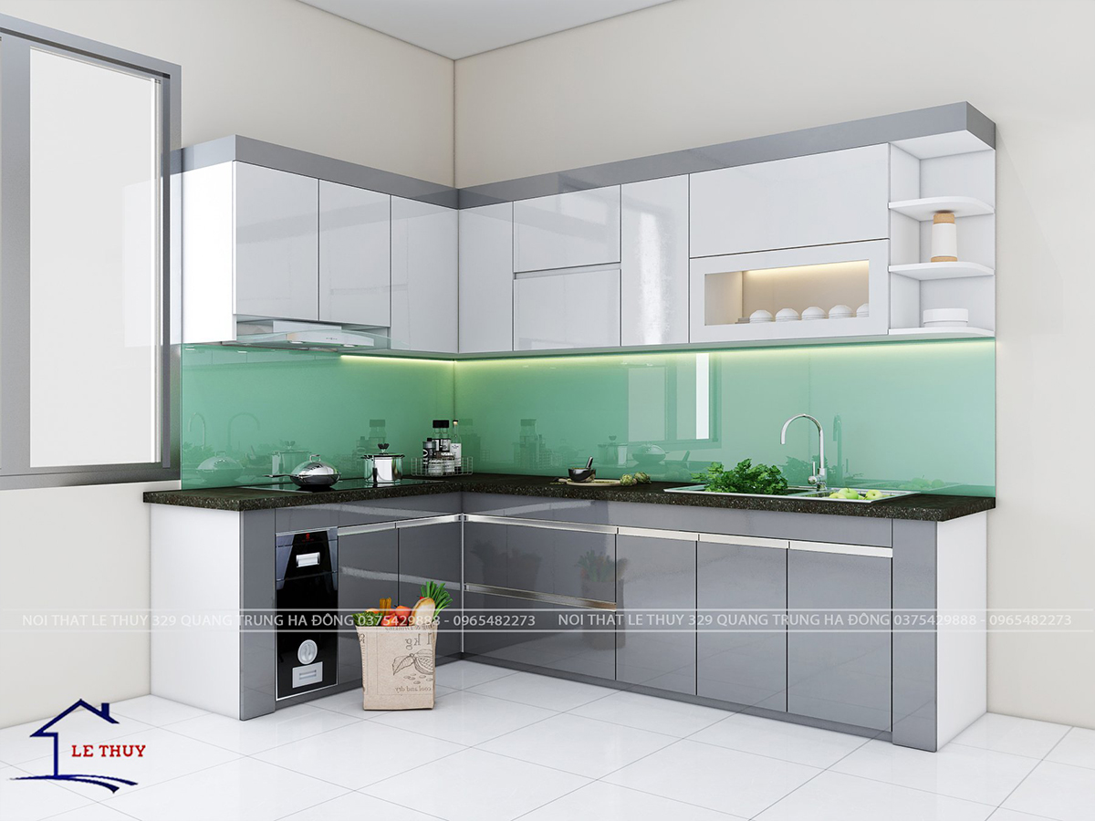 - Tủ bếp Acrylic thiết kế phù hợp với căn hộ có diện tích bếp rộng.