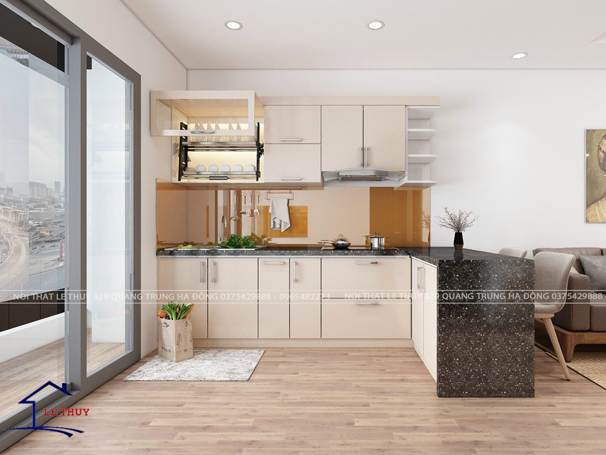 - Tủ bếp gỗ công nghiệp An Cường acrylic A24 được thiết kế với kiểu dáng chữ L