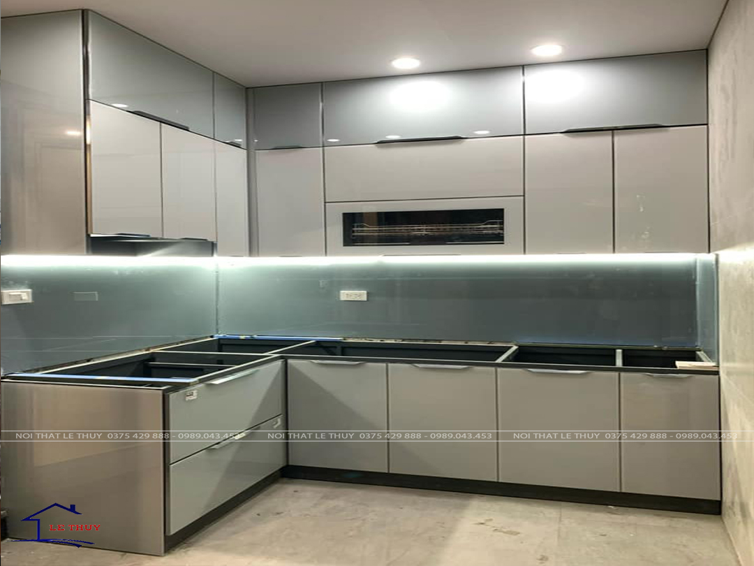 - tủ bếp được thiết kế với kích thước tiêu chuẩn cho tủ bếp trên là 350×700 và tủ bếp dưới là 550×810, mẫu tủ kịch trần phụ thuộc theo chiều cao mỗi nhà
