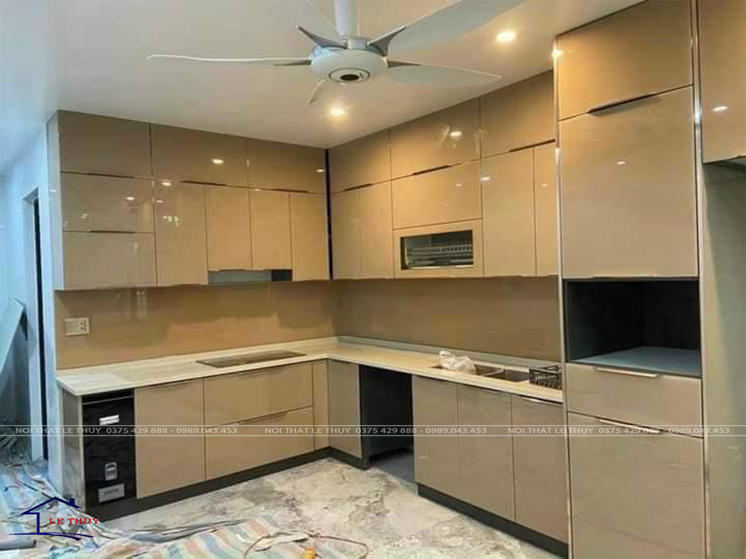 • tủ bếp được thiết kế với kích thước tiêu chuẩn cho tủ bếp trên là 350×700 và tủ bếp dưới là 550×810, mẫu tủ kịch trần phụ thuộc theo chiều cao mỗi nhà